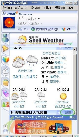 在MSN的主界面可以看到在好友窗口下面多了一个天气标签,点击该标签进入天气预报界面,默认为首都北京的天气。我们可以通过设置来获得其他城市的天气预报信息。根据箭头指向选择“设置”按纽(如图7),选择城市等地区信息,再增加,就能在已选择的城市清单中看到(如图8),选择好以后“确定”退出,一个新的城市的天气预报就弄好了(如图9)。
