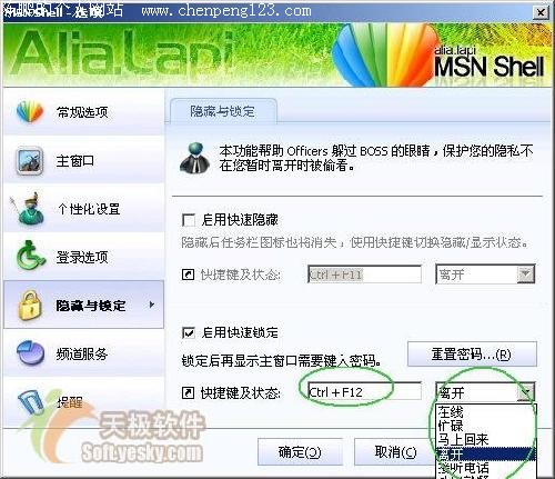 小提示:锁定时也可以使用快捷键,并设置状态,默认的快捷为“CTRL+F12”、状态为“离开”,如需要更改可以在“隐藏与锁定”中更改(如图12)。