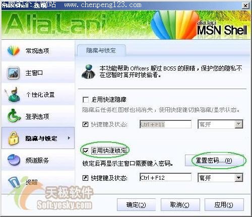 打开工具栏中“shell”,选择“设置”,再选择“隐藏与锁定”,就可以看到“启用快速锁定”的复选框,将其选中后,在点开“重置密码”(如图10),输入你的MSN密码后点确定就设置成功了(如图11)。需要锁定的时候,点“shell”菜单下的“锁定”就可以了。