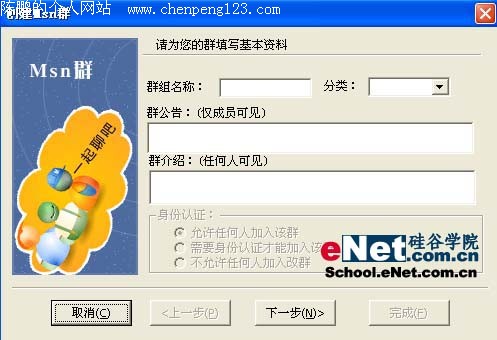 创造MSN群的非常简单,只要输入群组名称和分类就可以创建了,当然,你也可以按照需要输入群公告和群介绍,不过这两项是非必选项。笔者在创建的时候发现身份认证选择无法选择,默认为允许任何人加入,可能是因为是测试版的原因,功能尚未完善吧。如图2