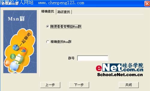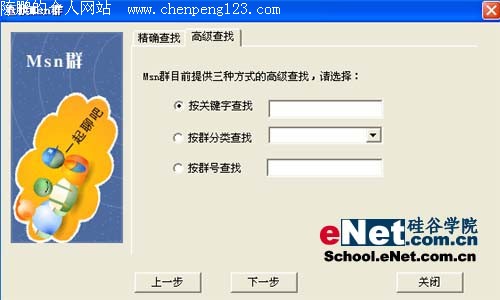 MSN群查找功能比QQ群查找功能更为强大,分为“精确查找”和“高级查找”两部分,在“精确查找”中可以随便查找MSN群加入,非常方便。“高级查找”中可以按照关健字查找,群分类查找,群号查找。如图3