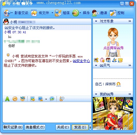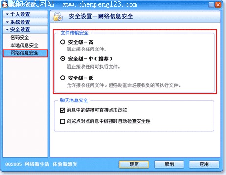 文件传输是QQ用户最喜爱的功能之一,使用广泛,因此过去它也成为了一些病毒传播和攻击的途径。QQ2005 Beat3新增的文件传输安全保护功能,允许用户设定不同的文件传输安全级别(高、中、低),最大限度地保护了QQ用户免受某些文件(例如,.exe 和 .bat 文件等)的攻击。 安装QQ2005 Beta3之后,默认的文件传输安全级别是“中”,当任何人尝试向您发送任何可执行文件(例如,.exe 和 .bat 文件等)时,QQ安全中心将自动阻止该文件的接收。当然,您也可以通过在“安全设置”中设定其他文件传输安全级别,来调整最适合您的文件传输安全保护强度。