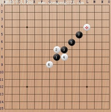 如图:黑方以花月开局,黑5与白6的形状象把短剑,黑7冲4,白8防守,这棋局形状象一把长剑.此阵变化很多.可以多方面尝试.