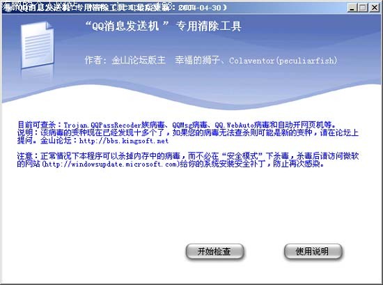 最近在学校里的机器很多都中了QQ病毒,竟然连还原精灵也挡不住,然后就去瑞星下载了个QQ病毒专杀工具,可是发现病毒仍然顽固的存在着,无奈之下又去了金山论坛看了看,又重新下载了个工具,原来最新出来的QQ病毒竟然可以驻留内存。这下总算是把问题给解决了,这里介绍给大家使用,希望能有帮助! 目前可查杀:Trojan.QQPassRecoder族病毒、QQMsg病毒、QQ.WebAuto病毒和自动开网页机等。 说明:该病毒的变种现在已经发现十多个了,如果您的病毒无法查杀则可能是新的变种,请在论坛上提问。 注意:正常情况下本程序可以杀掉内存中的病毒,而不必在“安全模式”下杀毒,杀毒后请访问微软的网站(http://windowsupdate.microsoft.com)给你的系统安装安全补丁,防止再次感染。