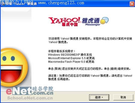 雅虎通6.0中文版发布有段时间了,其强大的功能可以与QQ、MSN相媲美。雅虎通是由yahoo公司开发的一款即时通讯聊天软件,在6.0新版本中,增加了yahoo公司的许多功能,现在就让我们来看一下这款新版、功能强大的即时聊天软件的使用方法。 点击下载雅虎通6.0中文版 一、软件安装 雅虎通6.0中文版的安装非常的简单,只需点击几次下一步就轻松完成了。首先我们看到的是软件的安装欢迎界面(如下图)。