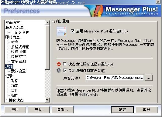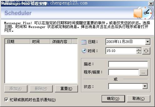 跟网友胡侃瞎聊很容易忘记时间。如果能让MSN在预定的时间提醒自己那该有多好。 一款功能强大的MSN第三方软件Messenger Plus!(下面简称Plus)就能帮我们解决这个问题。下载并安装Messenger Plus!完成后,在MSN的工具栏上有Plus的设置菜单。打开设置界面,在左边的项目框中,选择“通知”一项,将“启用Messenger Plus!通知窗口”一项勾起来。为了确保万无一失,你还能在下面设置在通知时发出声音。至于用什么声音就看你的喜好了。启用通知功能后,我们可以在设置菜单里打开“日程安排”,设定具体的提醒时间和提醒事件。时间一到,MSN就会自动跳出提醒窗口并播放声音提醒你了。