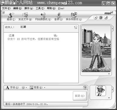 为了净化屏幕,我们可以通过在MSN Messenger Plus!上进行设置,让对方的污言秽语不再显现在MSN的对话窗口中。 插件名称:MSN Messenger Plus V3.00.92 软件大小:3424KB 下载地址:http://www2.skycn.com/soft/996.html 1. 安装完毕后,在MSN的主面板上会看到新增加了一个“Plus!”菜单栏,依次点击“Plus!→个人偏好设置”。 2. 在“个人偏好设置”窗口中,点击“即时消息”按钮,在出现的右侧栏目中打开“文字过滤”选项,再点击其中的“添加”按钮。 3. 在出现的“过滤器属性”对话框中,点选“您收到的消息”复选框,然后分别在“过滤该词”、“替换为”栏目里填写好相应的文字,注意替换文本的长度不得长于被过滤词的长度,最后点击“确定”按钮完成。 4. 测试结果。让好友发送带有过滤词的文本消息,我们可以看到这些过滤词都被替换成上面所设置的文字“XX”了,如图所示。
