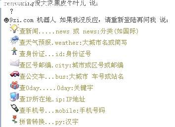 从小布的妮称上可以看到小布所在的网站:www.9zi.com。如果没有MSN,进入该网站,可以查到实用信息,这用MSN与小布对话可以查到的内容不完全相同。网站集成一些常用的搜索引擎,还可查ftp资源,域名是否注册,另外还介绍了一些硬件资讯、软件资讯和下载、编程交流等网站。新闻、天气预报、身份证、电话区号和邮编、各大城市公交车线路、汉字的注音,这些内容在网站上还不能查到。