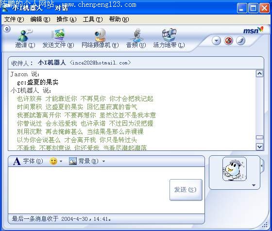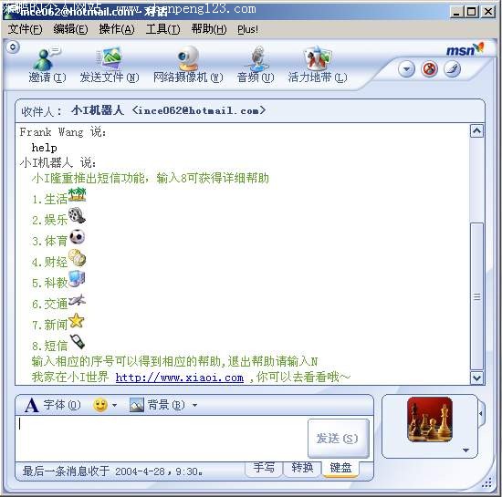 小I所推出的这个短信功能非常强大,操作起来也非常简单,只要在和小I的聊天对话框中输入规定格式的命令就可以了。与手机上输入汉字相比,这样的短信发送方式无疑给用户带来了极大的方便。而你的好友收到短信后也可以直接回复,系统将根据你的MSN是否在线选择发送至你的MSN或者手机号码,这充分体现了小I处处为用户考虑的服务意识。而同时,小I支持定时发送短信功能,这样,你就可以随时给自己设置各种不同的提醒了,也可以在你好友生日的时候送上你的第一个生日祝福,哪怕当时你在睡觉,小I也可以帮你完成哦!