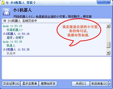 如果想和小I说话,只要在输入框里输入想说的话就可以了。和与好友聊天是一样的。如下图: