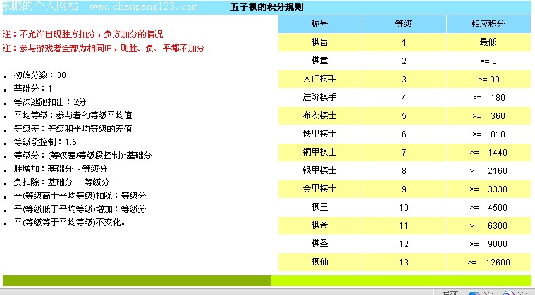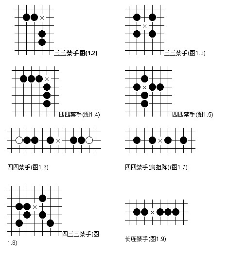 --五子棋的棋盘 棋盘正中一点为“天元”。棋盘两端的横线称端线。棋盘左右最外边的两条纵线称边线。从两条端线和两条边线向正中发展而纵横交叉在第四条线形成的四个点称为“星”。天元和星应在棋盘上用小圆点标出。 以持黑方为准,棋盘上的纵轴线从左到右用英文字母A~O标记。横行线从远到近用阿拉伯数字1~15标记。纵横轴上的横纵线交叉点分别用横纵线标记的名称合写成。 --UC子五棋的下载和安装 五子棋游戏属于朗玛UC的插件,需要在安装有UC平台的基础上才能运行。 --五子棋规则 一、行棋顺序 黑先(Start)、白后,从天元开始相互顺序落子。 二、判断胜负 最先在棋盘横向、竖向、斜向形成连续的相同色五个棋子的一方为胜。 黑棋禁手判负(Lose),白棋无禁手。黑棋禁手包括“三、三”(Double Three)(包括“四、三、三”)、“四、四” (Double Four)(包括“四、四、三”)、“长连”(Overline)。黑棋只能以“四、三”取胜。 如分不出胜负,则定为平局(Draw)。 对局中拔子、中途退场均判为负。 五连与禁手同时形成,先五为胜。 黑方禁手形成时,白方应立即指出。若白方未发现或发现后未指明而继续应子,则不能判黑方负。 三、规则的解释 术语介绍 A、阳线和阴线 1、 阳线:棋盘上可见的横纵直线。 2、 阴线:棋盘上无实线连接的隐形斜线。 B、连:在棋阳线和阴线的任意一条线上形成的有5个或5个以上的同色棋子不间隔地紧紧相连。 1、 五连:在棋盘上形成的5个同色棋子的"连"。 2、 长连:在棋盘上形成的6个或6个以上同色棋子的"连"。 C、"四"包括"活四"和"冲四"。 1、活四:在棋盘某一条阳线或阴线上有同色4子不间隔地紧紧相连,且在此4子两端延长线上各有一个无子的交叉点与此4子紧密相连。 2、冲四:除"活四"外的,再下一着棋便可形成五连,并且存在五连的可能性的局面。 3、 白棋再下一着可形成长连的局面也视为"四"。 D、"三"指活三,包括"连三"和"跳三"。 1、连三:在棋盘某一条阳线或阴线上有同色三子相连,且在此三子两端延长线上有一端至少有一个,另一端至少有两个无子的交叉点与此三子紧密相连。 2、跳三:中间仅间隔一个无子交叉点的连三,但两端延长线均至少有一个无子的交叉点与此三子相连。 E、禁手:对局中禁止使用的着法。 1、黑棋禁手包括"三三"、"四四"和"长连"。 1.1 三三:由于黑方走一着在无子交叉点上同时形成二个或二个以上黑方"活"的局面。 1.2 四四:由于黑方走一着在无子交叉点上同时形成二个或二个以上黑方"四"的局面。 2、白棋无禁手。 F、"四三":指某一方同时具备两个先手,其中一个是"四",一个是"活三"。 先手:对方必须应答的着法,其中"冲四"称为绝对先手。 G、三手可交换:是指黑棋下盘面第3着棋后,白方在应白④之前,如感觉黑方棋形不利于己方,可提出交换,即执白棋一方变为执黑棋一方,而黑方不可以不换。 H、五手两打:是指黑棋在下盘面上关键的第5手棋时,必须下两步棋,让白棋在这两步棋中任选一步,然后再继续对弈。一般说来,白棋肯定拿掉对白方不利的一点,而保留对黑方较为不利的那点让黑方行棋。