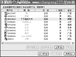 即时聊天工具UC正逐渐被人们所接受、喜欢,在被新浪网收购之后,UC更显王者风范,无论是服务上,还是在程序的稳定程度上都做的越来越好。下面笔者就给大家介绍一些UC使用时的一些心得技巧,希望各位能够喜欢。 1. 查找超时不用怕 作为即时通讯类工具,最主要的功能还是聊天,当然,聊天总需要查找或者搜索聊天对象的,不过在UC中,笔者时常遇见这样的情况,就是单击“查找用户”对话框中的“下一页”按钮的时候,UC的查找用户还是原来的那些用户,而且“下一页”按钮也变成了灰色不可用状态(如图1),那我们如何继续查找好友呢?方法很简单,单击“上一页”按钮,然后在单击两次“下一页”按钮,好了,现在我们又可以查找在线好友了。