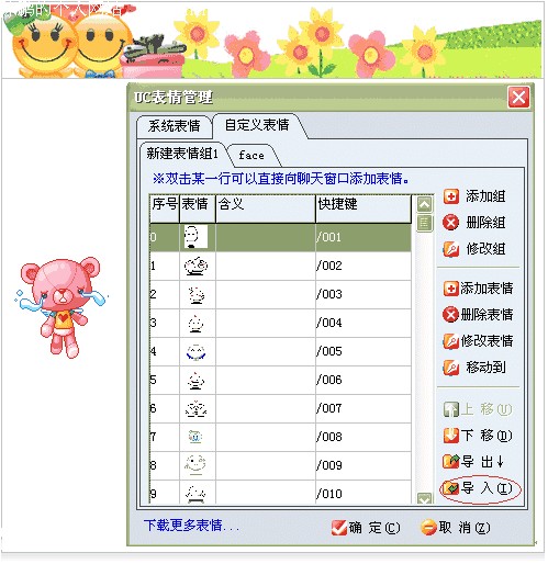 1. 首先,下载我们已经为您准备好的“自定义表情文件”,并保存在您的硬盘中。(一定要记住文件的保存位置哦) 2. 在UC客户端选择:自定义表情图释,并选择“导入”,如图: