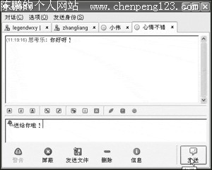 许多即时通讯软件都不具备在同一窗口中分别与不同好友聊天的功能,如果交谈的好友比较多,那么来回切换窗口时显得非常烦琐,Gaim则不然,它可以帮你在同一窗口中与不同账户进行交谈,此时所有交谈的好友将显示在同一个聊天窗口菜单栏的下面(见图2),如果要与某一好友聊天,那么直接点击该好友,然后输入你要交谈的内容并点击“发送”按钮即可,不必担心自己和该好友聊天的内容被其他好友看到。