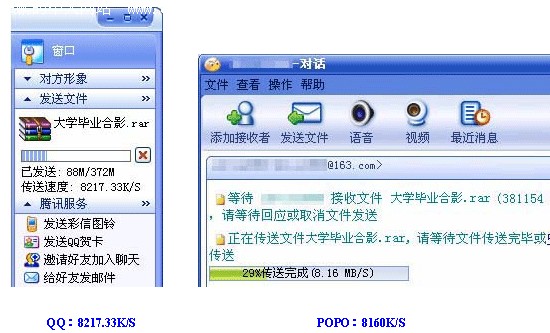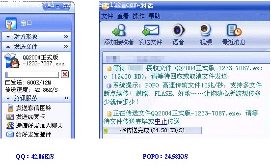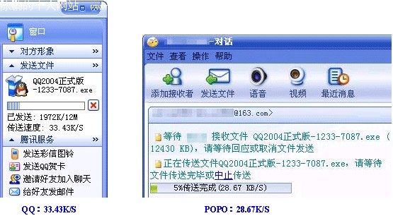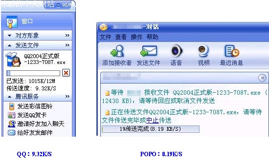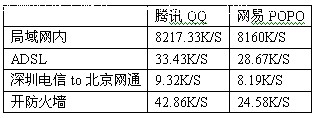 听说腾讯QQ 2004正式版前几天刚刚发布,还没出来之前就有人说QQ2004正式版功能如何如何之强,笔者怀着极大的好奇心情Down下来用一用。 虽说此版本推出了共享网络硬盘等诸多新颖独特的功能,但在笔者看来这些功能都不重要,由于工作需要,笔者用QQ做的最多的事还是传文件,没办法,就是方便。不过以前几个版本的文件传输速度都不是很快,所以新版下载下来以后,笔者最想看的就是传输速度快了没。记得QQ好像并不是第一个实现文件传送的IM软件,看看这个后起之秀到底怎么样。 笔者试着传了几个文件,发现速度的确快了不少,不过没有个横向对比,总认为是自己感觉,还是弄个软件比比的好。正好笔者就想起了网易泡泡。记得当初朋友向我推荐时说POPO号称在所有即时通信软件中传输速度最快,笔者不由萌发了让二者一比高下的念头。 局域网内 首先笔者测试了在局域网内部传文件(如图1)。