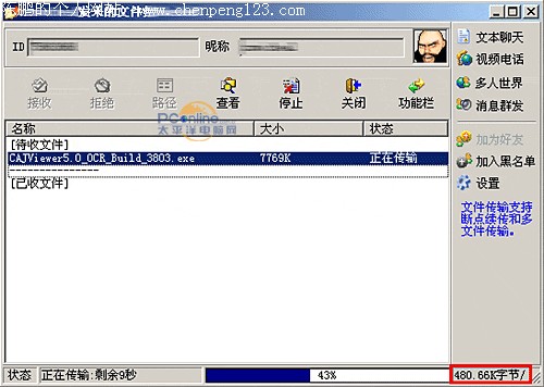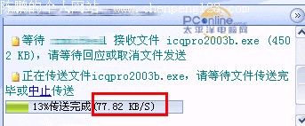 笔者使用的雅虎通6.0.0.1750中文版在文件传输方面表现不如人意。首先,超过一定大小(约10M左右)的文件雅虎通不能传输。其次,使用雅虎通传输文件,需要先把文件上传到服务器,然后对方用户再从服务器下载。在笔者的局域网内平均上传和下载速度都只有3KB/S。下图为雅虎通6.0中文版的文件传输截图。雅虎通在传输时没有速度的显示。