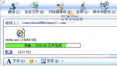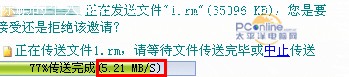 虽说MSN在国内没有服务器,但它的内网传输速度还值得称道。达到2550KB/S。遗憾的是,MSN在传输时不显示速度,所以我们无法记录传输峰值和谷值。用MSN传输文件还有一个小小的缺憾,就是从一个用户发出传输请求,到内网另一用户收到请求偶然会出现等待约30秒~1分钟的时间。而QQ、泡泡等国产IM软件的响应时间几乎为零。