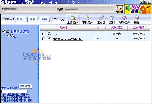 UC的免费硬盘最小32M,QQ最小16M,在容量上UC要大于QQ,在速度上,据我们的测试,UC的网络硬盘下载速度要高于QQ,上传速度大家不相上下。看来对喜欢网络移动存储的朋友,UC也是一个不错的选择。
