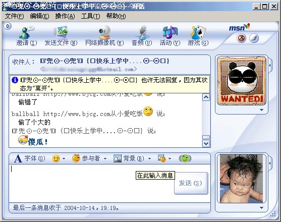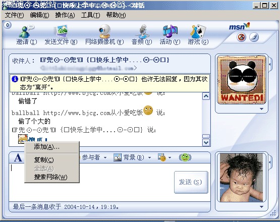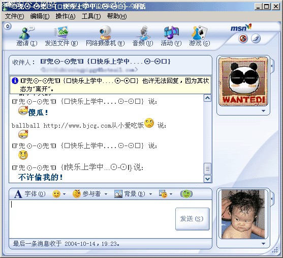 每次看到好友在MSN发过来的可爱表情,在MSN6.2以前,都是需要用截图软件,或者求好友发表情图片给自己。MSN 7在这个方面做了大幅度的改进,现在我们已经可以轻易的把表情偷到自己的MSN里面了。 1 如图1,好友发了一个可爱的表情过来。我们用鼠标点击这个表情上面,会有一个蓝框。
