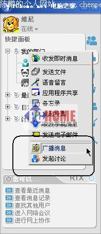 对于一家企业公司来说,时常需要对公司内的员工发布一些信息,传统的文件方式需要先打印出来,然后人工分发,若要收集员工的反馈信息则还要另外准备,因此效率比较低。现在有了腾讯通RTX之后,向员工发布信息通知则变得相当简单,同时还可以即时得到反馈信息。 [点击下载腾讯通RTX 客户端 3.3] [点击下载腾讯通RTX 服务器 3.3] 群发信息通知可以通过“广播消息”和“发起讨论”来实现(如图1),这两者都可对多人以及部门群发消息。