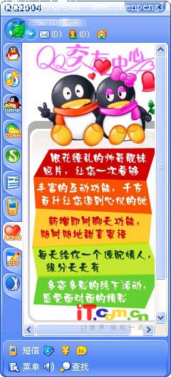 QQ2004在成功的推出Beta1后,于今天(11月8日)又火热发布了其最新版本QQ2004 Beta2,笔者第一时间拿到下载地址后,就迫不及待的下载安装并试用了最新版的QQ,笔者在试用过程中发现Beta2增加了许多富有创意、实用有趣的新功能,下面笔者就与大家一起来体验一下新版QQ带给我们的惊喜吧。 软件档案 软件名称:QQ2004 软件版本:Beta2 软件类型:测试版 软件语言:简体中文版 下载地址:http://im.qq.com/qq/mo.shtml?/download/qq2004ii.shtml 推荐等级:★★★★★ 下载安装文件后,安装是非常简单的,只要一路“下一步”就轻松完成了,在登录界面输入你的QQ号码与密码登录QQ后,发现QQ主界面没有发现大的变化,只是多了在左边分栏处多QQ游戏与QQ交友中心两个按钮(如图1),这样可以方便大家登录QQ游戏与QQ交友,另外QQ网络硬盘提到了第四个的位置,同样方便大家使用网络硬盘。闲话少说,下面我们就来看一下新版QQ给我们带来了哪些功能。