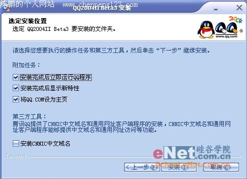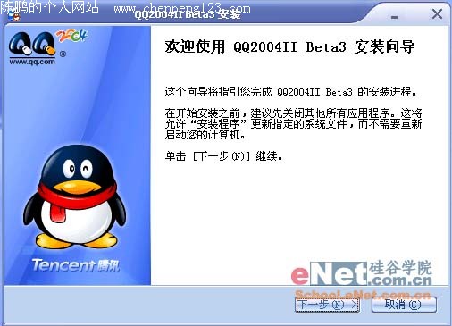 腾讯是国内IM软件的龙头老大了,其主打产品QQ在今年随着时间的推移,几次翻新推出新的版本,在上个月刚刚推出QQ2004II Beta 2,我们eNet学院做了详尽的评测,刚刚过去一个月,腾讯又再次更新推出QQ2004II beta3,前几天我们对其主要功能作了及时的报道,下面就请大家随笔者一起来体验新版QQ的几个重点功能。 点击下载QQ2004II Beta 3 一、 安装QQ2004II Beta3 下载安装文件后,双击就进入了QQ2004IIBeta3的安装过程(如图1所示),