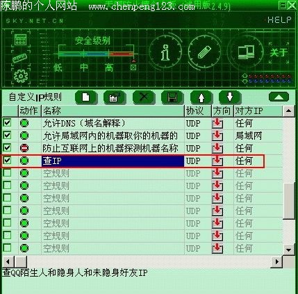 以后只要有陌生人或隐身人发消息给你,在天网防火墙中就会有记录,里面就有他们的IP地址!