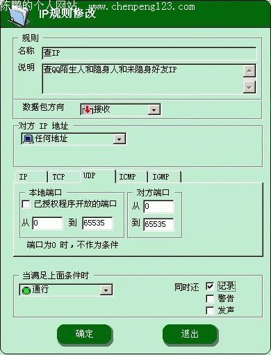 看到“名称”了吗?在“名称”后面的空白处写入“查IP”,在“说明”后面的空白处写入:查QQ陌生人和隐身人和未隐身好友IP;在“数据包方向”中选择“接收”;再下面是“对方IP地址”选项,请选择“任何地址”,再下是“IP、TCP、UDP、ICMP、IGMP”五个按钮,我们选择“UDP”,因为QQ使用的是UDP协议。在“本机端口”下输入0-65535,“对方端口”填法和本机端口填法一样。然后看在屏幕下方的“当满足上面条件时”中选择“通行”,在“同时还”后选择“记录”,点击“确定”按钮,这时回到了主界面,然后我们把刚刚建好的名称为QQ的规则前打上“√”(图2),再点“保存”,然后“应用新规则”即可。
