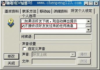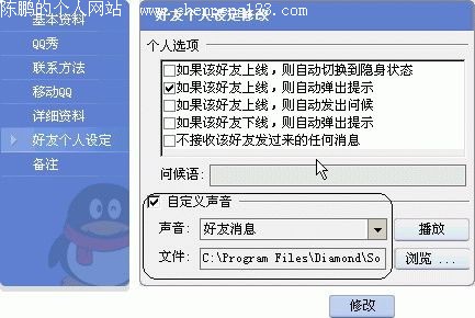 首先点选QQ好友的头像,选择菜单上的“查看资料”,弹出“查看用户信息”对话框,然后选择“好友个人设定”,在“自定义声音”前面打上“√”(图13),再点击“浏览”按钮来选择你希望好友上线时所听到的声音,声音文件只能用Wav格式,选好后在声音项里面选择“好友消息”,你可以点击“播放”按钮先来先听听效果,感觉不错的话就点击左面的“修改”按钮来完成设置。