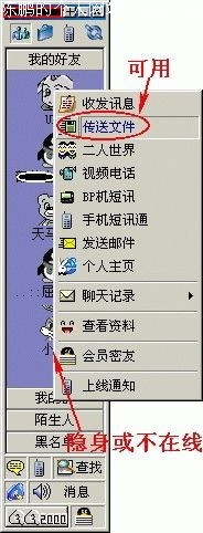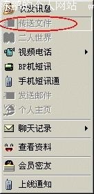 在QQ好友名单中用鼠标左键点击任意一个好友的头像,会出现一个弹出菜单,里面有个选项“传送文件”,如果好友在线且未隐身,该选项是高亮显示的可用状态。但是,如果QQ好友隐身或未上线,则这个选项是灰色不可用状态(图7)。本来这没有什么,也很正常,但是,就象我们前面说过的那样,对于隐身好友如果不修改QQ的文件,我们就无法给他传送文件。如果这个选项永远都是亮起来的可用状态,想想会怎么样?哈哈,那样就可以给隐身好友传送文件了!而且,这样一来保管你的好友大吃一惊——我隐身了他怎么还能给我传送文件呢?当然,另外一个好处就是你的朋友看到你的QQ这样与众不同,保证很佩服你,在他跟你学技术的过程中怎么也可以让他破费一点吧,呵呵!下面是具体的方法。