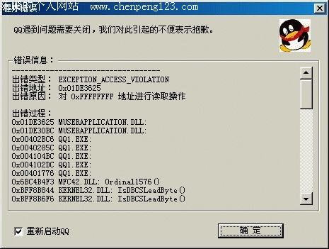 今天下午在安装一个软件时,无意中把系统日期调整到公元2048年,在试用软件完毕后忘记把时间改回来。晚上按照惯例打开QQ准备和好友们好好的聊一聊,却发现QQ无法运行起来,现象是点击桌面上的QQ图标之后,出现一个窗口提示“QQ出现问题需要关闭,我们对此引起的不便深表歉意”,如图所示(图10),点击“确定”按钮之后QQ自动重新启动,但问题依旧——还是无法登陆QQ。是不是病毒影响的呢?赶紧拿出最新的瑞星杀毒软件2003和金山毒霸2003进行查杀(病毒库都是刚刚升级的),检查结果表明系统干干净净,没有发现病毒。正纳闷间,鼠标无意中指向系统托盘中的日期,发现系统时间不对劲,这才想起来忘记改回到现在的日期,于是双击系统托盘中的时间图标,在出现的窗口中把时间改回到2003年,再运行QQ试试,终于可以上线,QQ又正常了!问题也得到了解决。如果你在入侵对方的电脑后,把系统日期改为2048年以后的时间,则对方的QQ就无法使用了,而他只要不留意的话,怎么也想不到是这个原因!就算他重新安装QQ100次也没有用!是不是很有趣啊?