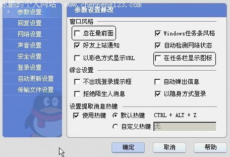 你有各种各样的理由不想让别人看到你在聊天,怎么办?虽然QQ的主界面在默认的设置中可以自动隐藏,任务栏中的QQ图标呢?也是很简单的,方法是:右击系统托盘中的QQ图标,选择弹出菜单中的“系统参数”,将“参数设置”中的“在任务栏显示图标”前面的“√”去掉。任务栏中的图标是不是已经没有了呢?如果同时将“总在最前面”取消选中,那隐蔽性就更强了(图11)。自己想打开的时候怎么办?用快捷键“Ctrl+Alt+Z”呀。