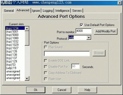 下载下来后,安装非常简单,一路点击“Next”即可。运行NukeNabber,点击“File”菜单下的“Options”选项,再点击该窗口中的“Advanced”标签,在“Port to monitor:”栏中填入4000(图9),然后点击“Add/Modify Port”将其加入到NukeNabber中,该端口就被占用掉。用同样的方法把网关封锁的其他端口占用掉就可以达到自由使用QQ的目的了!
