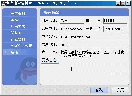 在很多情况下,好友中自己填写的个人资料很不准确。后来慢慢熟悉了,告诉了你相对准确的资料。这样一来,很多的好友会不会又弄混淆了?给好友加个注释就会方便很多了。QQ本身就又这个功能,你知道吗?方法是:首先打开某个好友的“查看用户信息”窗口,选择“备注”。咦?他的资料好像全部被清空了!没关系,你可以填写他的一些资料(图12),填写完成后,按一下“修改按钮”,系统就会提示修改完成。以后查看,只要记清楚“备注”就是你给他的注释,”资料“就是他自己填的资料,这下弄不混了吧?