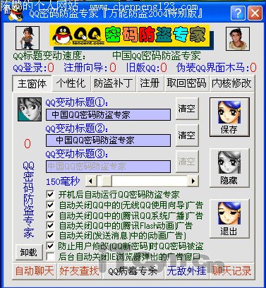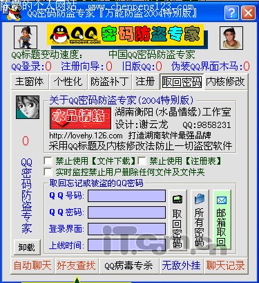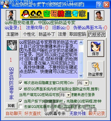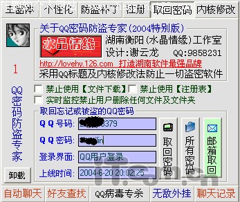 QQ是大家使用最多而又最容易被黑客盯上的聊天软件,大家都非常为QQ的安全担心,下面笔者就为大家找到了几个QQ安全好帮手,让你从此再也不必为QQ的安全担忧! 一、QQ防黑专家——QQ密码防盗专家 下载该软件 1.认识专家 QQ密码防盗专家的主界面如图1所示:它能够防止一些最新版的QQ盗密软件在你修改新密码时把你的QQ新密码记录下来;其个性化设置中能够隐藏或伪装你的QQ号,能够禁止QQ收发消息、禁示文件下载、禁用注册表、禁止文件及目录删除等;此外,QQ防盗补丁能够防止一切网页代码自动下载QQ病毒及修改系统注册表,并有QQ病毒清除方法,能够自动识别并提示该窗体是属于新版QQ、旧版QQ还是伪装QQ界面的木马,并能自身隐藏。下面我们就看看这位专家是如何给我们上门指导的。
