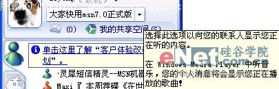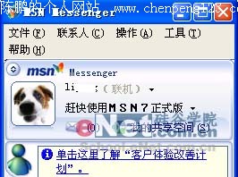 前段时间推出了MSN 7.0 beta测试版本,在测试版本中增加不少实用的功能,比如传情动漫、闪屏振动、支持手写等,让很多MSN用户大呼过瘾,现在微软再次推出了MSN7.0正式版,这个版本除了完善了测试版本中的一些功能外,还增加了一些非常个性、温馨的功能,比如能够把当前播放中的音乐送给好友欣赏、能够显示他人的个性图片等,下面就一起来看看新版MSN带给我们哪些惊喜! 一、设置你的个人消息 安装MSN7.0正式版并登录之后,很明显在主界面中原来你的名字下面多出了一个“<键入个人消息>”的灰色栏。