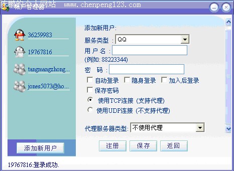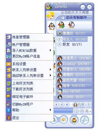 时下QQ太阳等级已成为众多网友追求的时新目标,且手中掌握多个QQ号码的网民人数众多,挂QQ已成为网民万众一心的行动。可是一台电脑同时挂上十几个QQ,占用内存实在庞大。因此如果有一个兼容IM能以一当十绝对最佳了。 实际上这样的软件已经产生,在这里介绍笔者利用新晋聊天软件MYIM进行挂机的心得。MYIM一大好处就是同时挂上几十个QQ,你也只在桌面上占用一个QQ的面积,而占用的内存甚至还没有一个QQ占用的内存大! 下载(软件下载地址:http://www.myim.cn/download.php )安装MYIM软件后,申请一个MYIM账户,然后把你手中的QQ账号添加进去就可以了,下图就是同时登陆有多个QQ在同一个面板中的状态。
