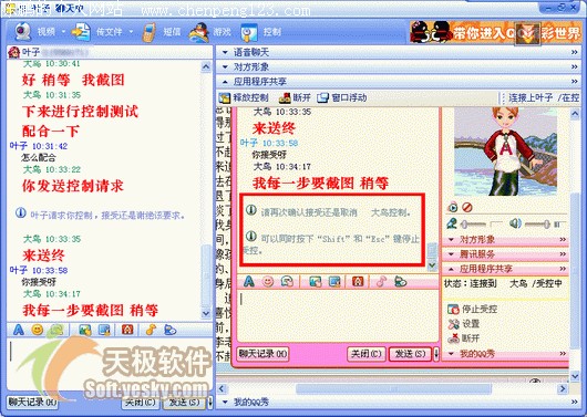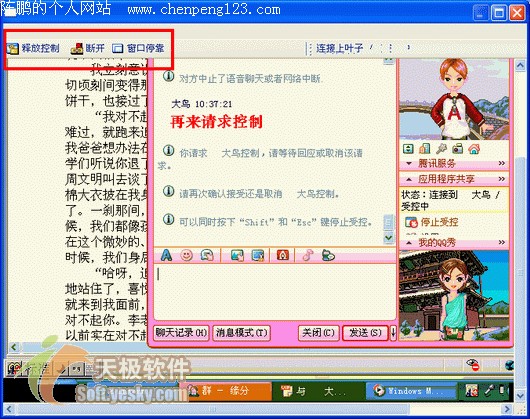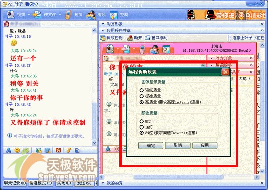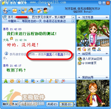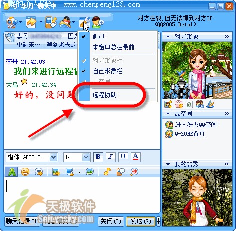使用过 Netmeeting 的朋友都会为对其远程桌面共享功能印象颇为深刻。的确,远程共享可以为我们提供很大的方便,但是由于建立互联需要 IP 地址的呼叫,服务器也不是分稳定。大多数人恐怕都有过因为找不到一个合适的服务器而大为头疼的经历。同时其对双方网络环境要求颇高,加上软件较为繁琐的设置和普及率等原因,所以一直是少数人使用的功能。新版QQ中的远程协助功能可以帮您很轻松的完成,设置也十分简单。请让我一步步详细为您介绍此功能。 首先我们弄明白什么是远程共享。 远程共享--通过软件和互联协议实现对远程计算机上某些功能的享用。通俗的讲,就是可以操纵对方的电脑。 可以用来干什么――远程共享因其优点已经较为广泛的应用于教学和通讯方面,并且发挥了重要作用。限于开发软件和传输速度没能进一步普及。但是可以肯定,这项功能在将来的互联网共享应用之中必将发挥重要作用。 由于远程协助属于窗口类的功能,所以 QQ 将其启动放在了聊天窗口工具中,点击消息模式中上方的窗口功能,选择“远程协助”。 图1