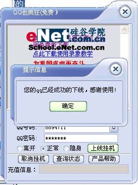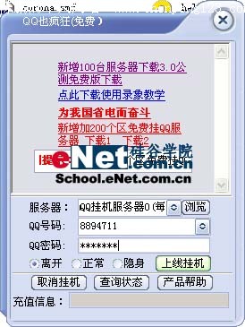 使用QQ也疯狂无论是在网吧,还是在家里,只要可以上网就能够轻松自如地控制您的QQ上下线,使用起来也非常简单方便,并且不占用电脑资源。