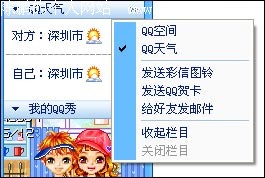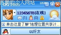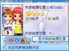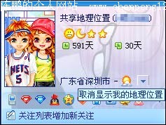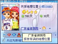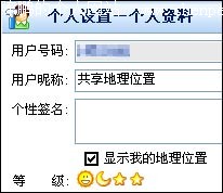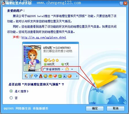 什么是"共享地理位置和天气预报"功能? "共享地理位置和天气预报"功能是腾讯公司在QQ 2005 Beta3中推出的新功能,选用了该功能的用户可以在自己的头像tips(即用户提示)里看到自己所处城市名称和天气预报,同时也可以在自己的头像tips里,看到其它选用了这个功能的好友所处的城市名称和天气预报。 选用"共享地理位置和天气预报"功能的操作步骤是? 当您安装了QQ2005Beta3版本后,第一次登录时,QQ主面板上会有一个选择"共享地理位置"的提示,显示为一个黄色的小消息条。