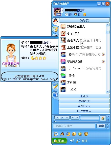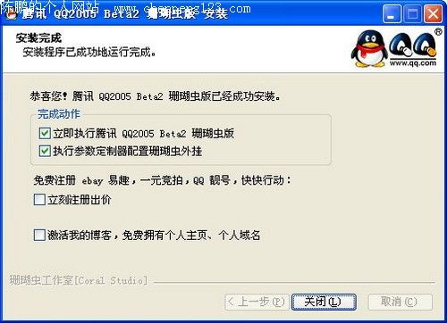 在使用QQ和好友聊天的时候,经常有陌生人在不问我的情况下就能说出我所在的省市,有的时候甚至能精确到街道、网吧名称。对于很多菜鸟来说,觉得实在有些不可思议。今天,我就借给大家一双慧眼,让你在聊天的时候快速查看QQ好友的IP地址。 一、找寻“慧眼” 大家可以登录http://nj.onlinedown.net/soft/32845.htm,下载腾讯QQ 2005 Beta 2珊瑚虫版V3.1.4,软件大小为17.7MB。 二、长上“慧眼” 双击下载的“IPQQ2005.exe”文件就可以一步一步进行安装,按照默认的方式安装即可,最后会出现一个窗口,可以选择“立即执行腾讯QQ2005 Beta2珊瑚虫版”和“执行参数定制器配置珊瑚虫外挂”复选框(图1),单击“关闭”按钮,下面将运行QQ和外挂配置窗口。
