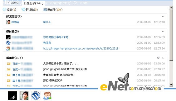 该功能主要是用于留言\群讨论与新邮件,如果哪个有消息的话都会显示在这里;最底部闪动的标志为正在活动的好友,也就是有好友向你发送消息,或者群的信息;