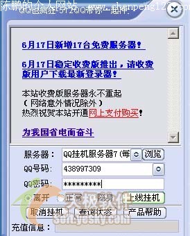 自从QQ推出了以在线时长累积等级制度以来,很多网友都热衷于泡QQ,有时为泡到一个小太阳甚至不分昼夜的开着电脑挂机。这样白白浪费的电力资源不说,还要在晚上饱尝电脑噪音之苦。 笔者曾尝试过几款挂机软件,都因软件需收费而作罢。近日,试用一款免费QQ挂机软件:QQ也疯狂免费版,感觉很不错。 下载QQ也疯狂免费版 通过这款软件,无论何时何地,都可控制您的QQ上下线,简单操作,轻松挂机。而且即使你关机,也不影响你QQ的挂机。并且它可以进行远程操作管理,不占用用户本机任何资源。保证用户计算机正常运作。 软件安装运行后画面如图1所示