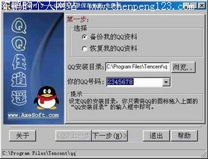 如果不是QQ会员,在外上网时一定会经常遇到这些烦恼——无法保存QQ 聊天记录 、记不起QQ中好友的身份……如果你用了“QQ任逍遥”这个软件,这些问题都可以解决了。 特色功能 可以将本机的QQ聊天记录、好友分组、个人信息、 系统设置 、聊天室设置等所有 QQ资料 保存到预设的电子邮箱中。在需要的时候又可以方便地把这些保存的QQ资料恢复到本地的电脑上。 备份资料 1.启动该软件,打开程序的主窗口选择“备份我的QQ资料”项(图1), 再设置好QQ的安装目录。设置好后,在“你的 QQ号码 ”后面的列表框中,会列出当前电脑上 QQ安装 目录中的所有QQ号码。根据需要选择需要备份的QQ号。