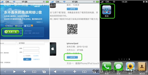 而如果以客户端的形式来云存储,最大的方便就是可以随时同步本地文件到网络服务器,而且支持手机数据同步!可见酷盘的跨平台存储能力是相当强大的。酷盘同时支持Android和iPhone/iPod touch手机平台,下载安装也是很方便的;使用iPhone自带浏览器(Safari)或第三方浏览器来下载安装,操作示意如图4所示。