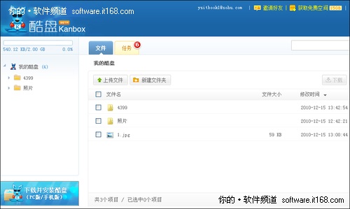 网络硬盘(也称为网络U盘)由于存取方便、稳定安全等特点,所以非常方便于经常需要异地存取数据的用户;但由于大多只提供3-5GB的免费存储空间,故应用延展性还不够强大。近来,国内著名的网络存储服务“酷盘(Kanbox)”就针对此情况进行了全新升级:从2010年12月24日起酷盘用户可将空间免费升级至15G,登录或注册后即可获取空间。登陆酷盘官网即可了解详情,如图1所示。
