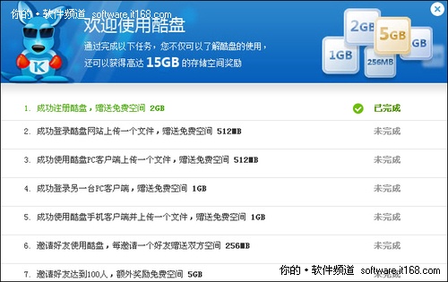 通过简单完成几个任务操作,酷盘老用户即可将原有2GB空间升级到15GB。具体操作过程也很简单,以注册邮箱登陆后即可点击进入“获取免费空间”的升级指引,如图2所示。通过完成这些“举手之劳”的任务,用户不仅可详细了解到酷盘的使用,同时也收获到了更大的存储空间,可谓一举两得!