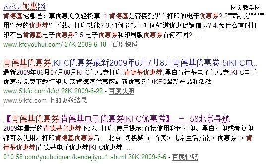 1,比较直观,普通用户例如进入百度搜索他们想要的信息,当然会输入相关关键词,例如“肯德基优惠券”这个词搜索出来大家可以看见如下截图: