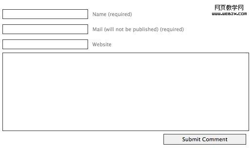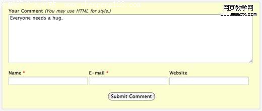 vadim,usabilitypost 的读者,发表过一篇很有意思的文章,《评论表单设计》。文章里说他在网上留心很久,发现了网上的大多数表单都把“姓名”和“Email” 作为必填的选项,不过作为评论表单来说和传统表单应该有区别了,除了“姓名”和“Email”外,“评论项”也是必不可少的,如图: