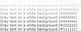 留意颜色的对比 对于视力不太好的人或者对于不太好的显示设备来说,黑地白字或者白底黑字是最佳的。 在亮色背景上的灰色文字,对比度是很差的: